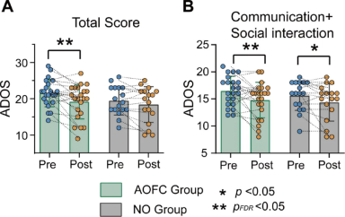 In the AOFC group, all 23 participants completed the treatment, 22 completed post-treatment ADOS and behavioral scale assessments, and 18 completed post-treatment MRI scans. In the NO group, 19 participants completed the treatment, 17 completed post-treatment ADOS assessments, 15 completed behavioral scale assessments, and 15 completed post-treatment MRI scans.